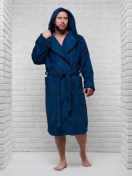 Халат мужской махровый PandaHug с капюшоном, синий